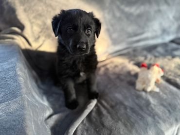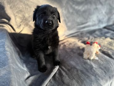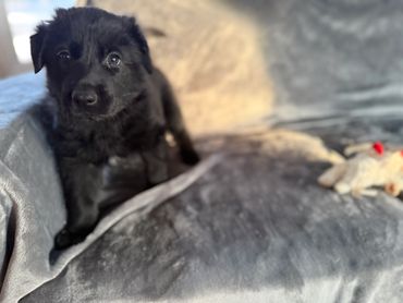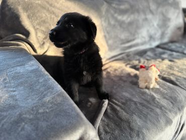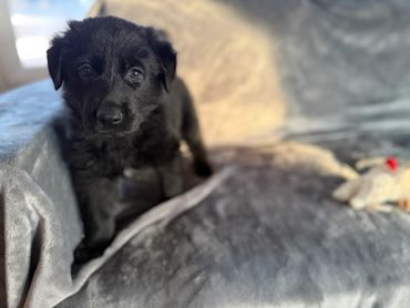 Tiana is a playful girl who loves attention. She's usually one of the first to climb into our lap and loves to be pet, scratched, and payed with. She’s just starting to potty train and is enjoying getting to know our adult dogs and cats. The little white star on her chest makes her stand out from her littermates (though this is likely to disappear when she loses her puppy coat.) We believe she'll bond very closely to her person/family and be a great protector.
